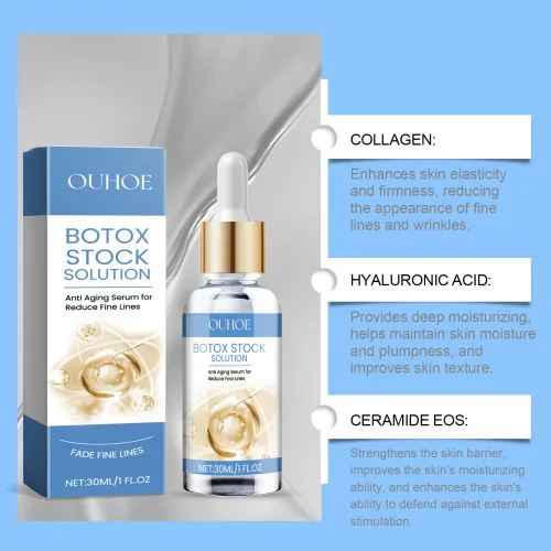 Our anti-wrinkle facial serum contains collagen and hyaluronic acid. It can have an anti-wrinkle effect that removes wrinkles and fine lines from the skin, leaving it smoother and more polished. Its application method is very simple: thoroughly clean the skin, dry first, take 2-3 drops of this product, evenly apply on the face, gently massage with your hands until completely absorbed. And can be unique formula design and strong market competitiveness. High quality packaging, suitable for gifts.